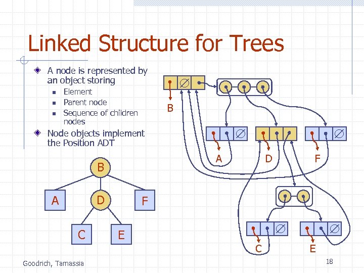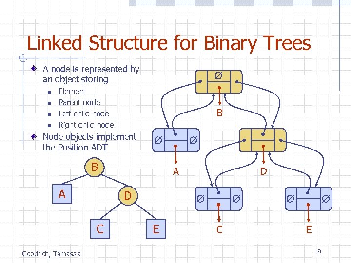 Linked Structure for Trees A node is represented by an object storing n n n Element Parent node Sequence of children nodes B Node objects implement the Position ADT A B D A C D F E C Goodrich, Tamassia F E 18