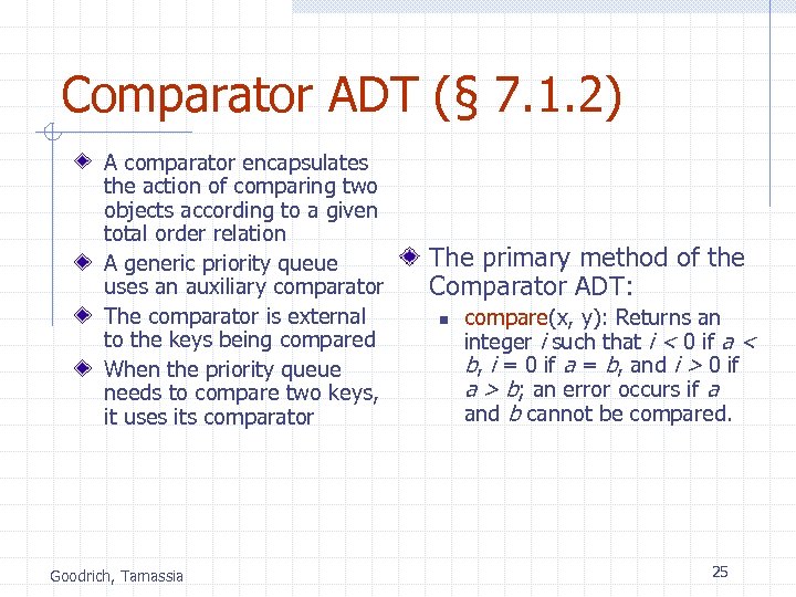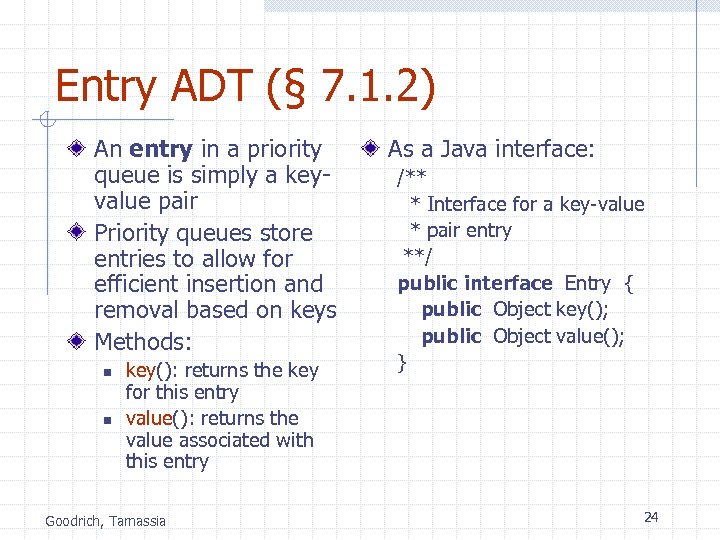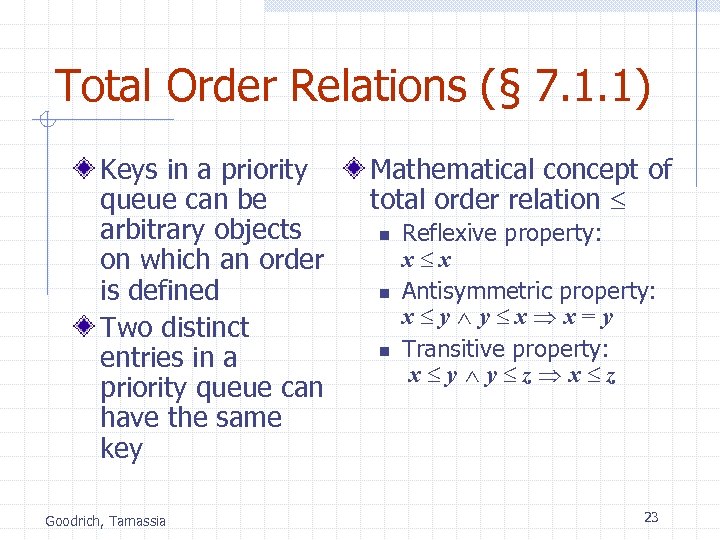 Total Order Relations (§ 7. 1. 1) Keys in a priority queue can be arbitrary objects on which an order is defined Two distinct entries in a priority queue can have the same key Goodrich, Tamassia Mathematical concept of total order relation n n n Reflexive property: x x Antisymmetric property: x y y x x=y Transitive property: x y y z x z 23