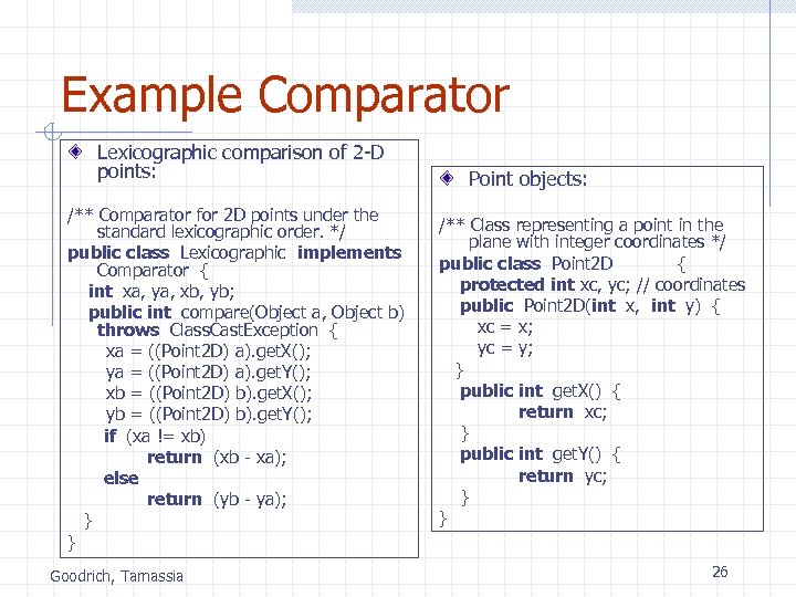 Example Comparator Lexicographic comparison of 2 -D points: /** Comparator for 2 D points under the standard lexicographic order. */ public class Lexicographic implements Comparator { int xa, ya, xb, yb; public int compare(Object a, Object b) throws Class. Cast. Exception { xa = ((Point 2 D) a). get. X(); ya = ((Point 2 D) a). get. Y(); xb = ((Point 2 D) b). get. X(); yb = ((Point 2 D) b). get. Y(); if (xa != xb) return (xb - xa); else return (yb - ya); } } Goodrich, Tamassia Point objects: /** Class representing a point in the plane with integer coordinates */ public class Point 2 D { protected int xc, yc; // coordinates public Point 2 D(int x, int y) { xc = x; yc = y; } public int get. X() { return xc; } public int get. Y() { return yc; } } 26