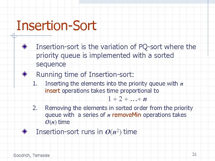 Selection-Sort Example Input: Sequence S (7, 4, 8, 2, 5, 3, 9) Priority Queue P Phase 1 (a) (b). . . (g) (4, 8, 2, 5, 3, 9) (8, 2, 5, 3, 9). . . () (7, 4) Phase 2 (a) (b) (c) (d) (e) (f) (g) (2, 3) (2, 3, 4, 5) (2, 3, 4, 5, 7, 8) (2, 3, 4, 5, 7, 8, 9) (7, 4, 8, 5, 3, 9) (7, 4, 8, 5, 9) (7, 8, 9) (9) () Goodrich, Tamassia () (7, 4, 8, 2, 5, 3, 9) 30