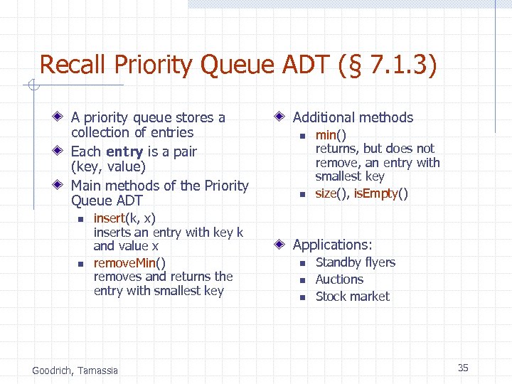 Priority Queue ADT (§ 7. 1. 3) A priority queue stores a collection of entries Each entry is a pair (key, value) Main methods of the Priority Queue ADT n n insert(k, x) inserts an entry with key k and value x remove. Min() removes and returns the entry with smallest key Goodrich, Tamassia Additional methods n n min() returns, but does not remove, an entry with smallest key size(), is. Empty() Applications: n n n Standby flyers Auctions Stock market 22