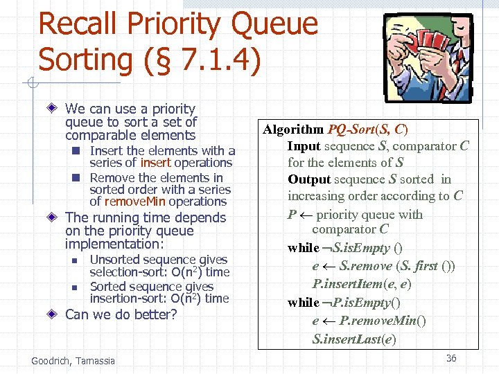 Priority Queue Sorting (§ 7. 1. 4) We can use a priority queue to sort a set of comparable elements 1. Insert the elements one by one with a series of insert operations 2. Remove the elements in sorted order with a series of remove. Min operations The running time of this sorting method depends on the priority queue implementation Goodrich, Tamassia Algorithm PQ-Sort(S, C) Input sequence S, comparator C for the elements of S Output sequence S sorted in increasing order according to C P priority queue with comparator C while S. is. Empty () e S. remove. First () P. insert (e, 0) while P. is. Empty() e P. remove. Min(). key() S. insert. Last(e) 27