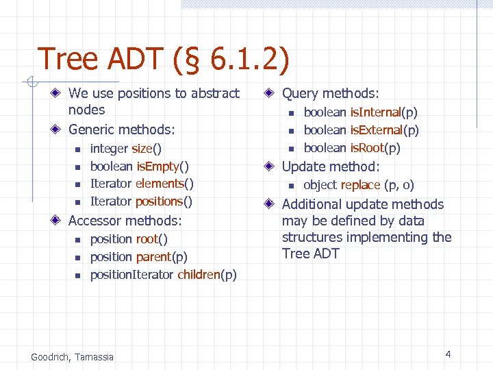 Tree ADT (§ 6. 1. 2) We use positions to abstract nodes Generic methods: n n integer size() boolean is. Empty() Iterator elements() Iterator positions() Accessor methods: n n n position root() position parent(p) position. Iterator children(p) Goodrich, Tamassia Query methods: n n n boolean is. Internal(p) boolean is. External(p) boolean is. Root(p) Update method: n object replace (p, o) Additional update methods may be defined by data structures implementing the Tree ADT 4