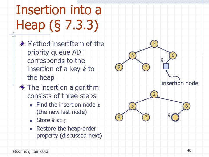 Insertion into a Heap (§ 7. 3. 3) Method insert. Item of the priority queue ADT corresponds to the insertion of a key k to the heap The insertion algorithm consists of three steps n n n Find the insertion node z (the new last node) Store k at z Restore the heap-order property (discussed next) Goodrich, Tamassia 2 5 9 6 z 7 insertion node 2 5 9 6 7 z 1 40