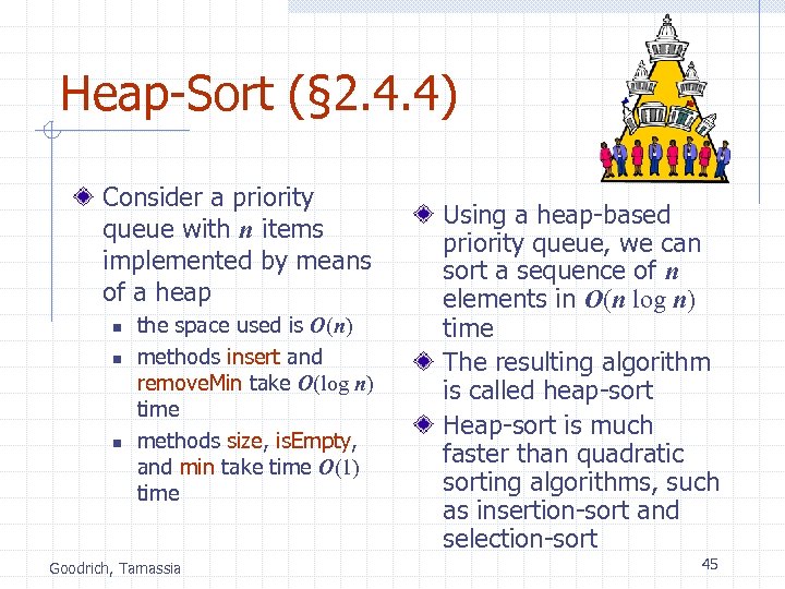 Heap-Sort (§ 2. 4. 4) Consider a priority queue with n items implemented by means of a heap n n n the space used is O(n) methods insert and remove. Min take O(log n) time methods size, is. Empty, and min take time O(1) time Goodrich, Tamassia Using a heap-based priority queue, we can sort a sequence of n elements in O(n log n) time The resulting algorithm is called heap-sort Heap-sort is much faster than quadratic sorting algorithms, such as insertion-sort and selection-sort 45
