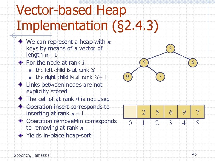 Vector-based Heap Implementation (§ 2. 4. 3) We can represent a heap with n keys by means of a vector of length n + 1 For the node at rank i n n the left child is at rank 2 i the right child is at rank 2 i + 1 Links between nodes are not explicitly stored The cell of at rank 0 is not used Operation insert corresponds to inserting at rank n + 1 Operation remove. Min corresponds to removing at rank n Yields in-place heap-sort Goodrich, Tamassia 2 5 6 9 7 2 0 5 6 9 7 1 2 3 4 5 46