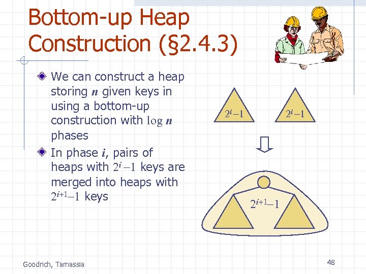Bottom-up Heap Construction (§ 2. 4. 3) We can construct a heap storing n given keys in using a bottom-up construction with log n phases In phase i, pairs of heaps with 2 i -1 keys are merged into heaps with 2 i+1 -1 keys Goodrich, Tamassia 2 i -1 2 i+1 -1 48