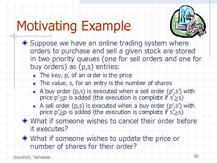 Motivating Example Suppose we have an online trading system where orders to purchase and sell a given stock are stored in two priority queues (one for sell orders and one for buy orders) as (p, s) entries: n n The key, p, of an order is the price The value, s, for an entry is the number of shares A buy order (p, s) is executed when a sell order (p’, s’) with price p’