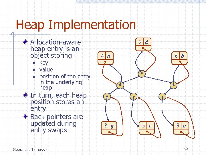 Heap Implementation A location-aware heap entry is an object storing n n n key value position of the entry in the underlying heap In turn, each heap position stores an entry Back pointers are updated during entry swaps Goodrich, Tamassia 2 d 4 a 8 g 6 b 5 e 9 c 62