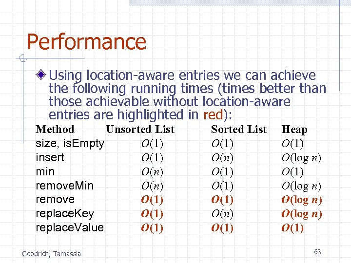 Performance Using location-aware entries we can achieve the following running times (times better than those achievable without location-aware entries are highlighted in red): Method Unsorted List size, is. Empty O(1) insert O(1) min O(n) remove. Min O(n) remove O(1) replace. Key O(1) replace. Value O(1) Goodrich, Tamassia Sorted List O(1) O(n) O(1) Heap O(1) O(log n) O(1) 63