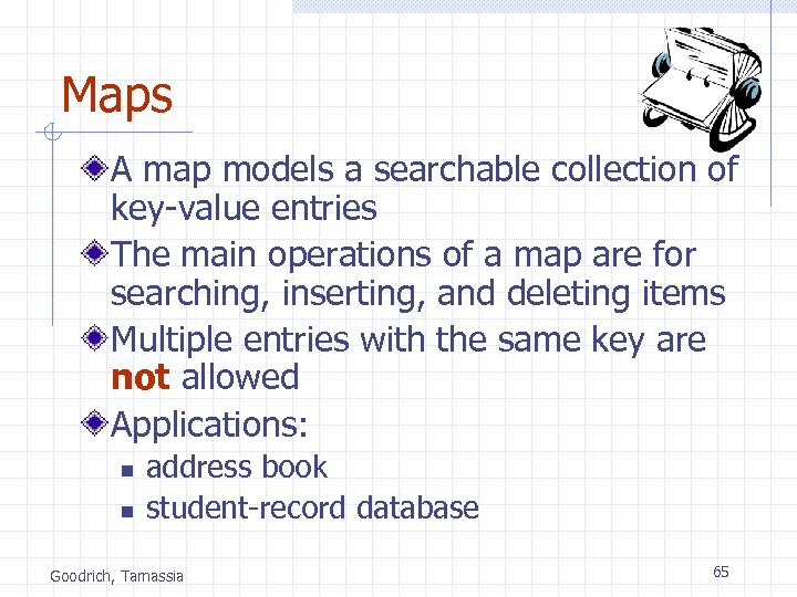 Maps A map models a searchable collection of key-value entries The main operations of a map are for searching, inserting, and deleting items Multiple entries with the same key are not allowed Applications: n n address book student-record database Goodrich, Tamassia 65