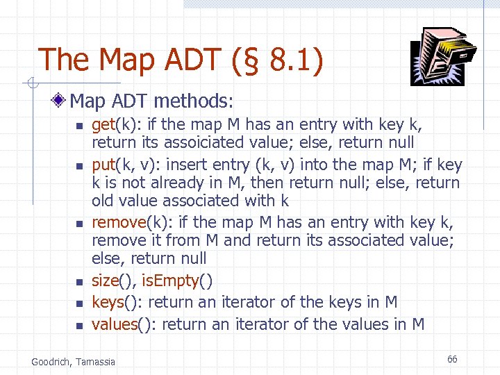 The Map ADT (§ 8. 1) Map ADT methods: n n n get(k): if the map M has an entry with key k, return its assoiciated value; else, return null put(k, v): insert entry (k, v) into the map M; if key k is not already in M, then return null; else, return old value associated with k remove(k): if the map M has an entry with key k, remove it from M and return its associated value; else, return null size(), is. Empty() keys(): return an iterator of the keys in M values(): return an iterator of the values in M Goodrich, Tamassia 66