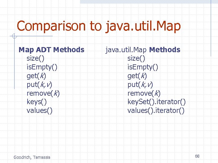 Comparison to java. util. Map ADT Methods size() is. Empty() get(k) put(k, v) remove(k) keys() values() Goodrich, Tamassia java. util. Map Methods size() is. Empty() get(k) put(k, v) remove(k) key. Set(). iterator() values(). iterator() 68