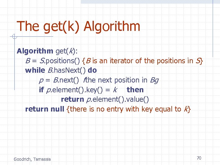 The get(k) Algorithm get(k): B = S. positions() {B is an iterator of the positions in S} while B. has. Next() do p = B. next() fthe next position in Bg if p. element(). key() = k then return p. element(). value() return null {there is no entry with key equal to k} Goodrich, Tamassia 70