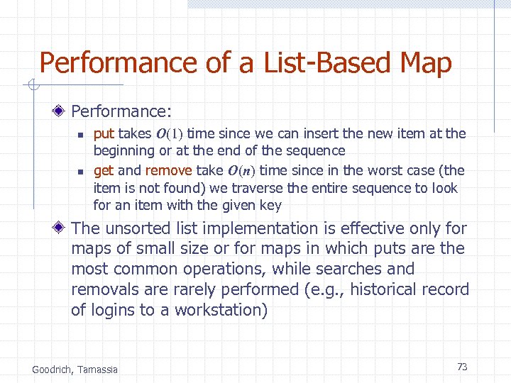 Performance of a List-Based Map Performance: n n put takes O(1) time since we can insert the new item at the beginning or at the end of the sequence get and remove take O(n) time since in the worst case (the item is not found) we traverse the entire sequence to look for an item with the given key The unsorted list implementation is effective only for maps of small size or for maps in which puts are the most common operations, while searches and removals are rarely performed (e. g. , historical record of logins to a workstation) Goodrich, Tamassia 73