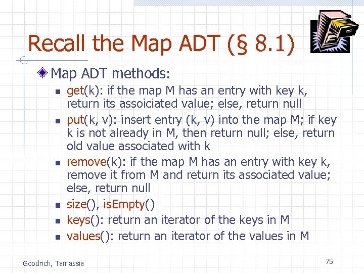 Recall the Map ADT (§ 8. 1) Map ADT methods: n n n get(k): if the map M has an entry with key k, return its assoiciated value; else, return null put(k, v): insert entry (k, v) into the map M; if key k is not already in M, then return null; else, return old value associated with k remove(k): if the map M has an entry with key k, remove it from M and return its associated value; else, return null size(), is. Empty() keys(): return an iterator of the keys in M values(): return an iterator of the values in M Goodrich, Tamassia 75