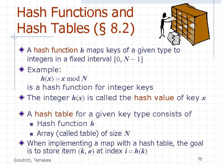 Hash Functions and Hash Tables (§ 8. 2) A hash function h maps keys of a given type to integers in a fixed interval [0, N - 1] Example: h(x) = x mod N is a hash function for integer keys The integer h(x) is called the hash value of key x A hash table for a given key type consists of n Hash function h n Array (called table) of size N When implementing a map with a hash table, the goal is to store item (k, o) at index i = h(k) Goodrich, Tamassia 76