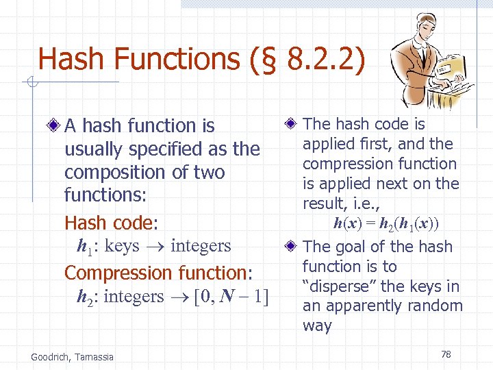 Hash Functions (§ 8. 2. 2) A hash function is usually specified as the composition of two functions: Hash code: h 1: keys integers Compression function: h 2: integers [0, N - 1] Goodrich, Tamassia The hash code is applied first, and the compression function is applied next on the result, i. e. , h(x) = h 2(h 1(x)) The goal of the hash function is to “disperse” the keys in an apparently random way 78