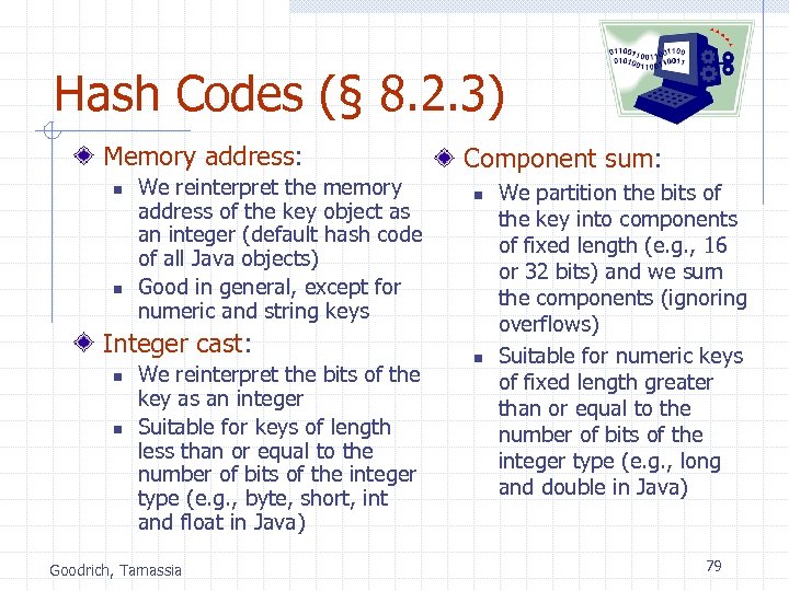 Hash Codes (§ 8. 2. 3) Memory address: n n We reinterpret the memory address of the key object as an integer (default hash code of all Java objects) Good in general, except for numeric and string keys Integer cast: n n We reinterpret the bits of the key as an integer Suitable for keys of length less than or equal to the number of bits of the integer type (e. g. , byte, short, int and float in Java) Goodrich, Tamassia Component sum: n n We partition the bits of the key into components of fixed length (e. g. , 16 or 32 bits) and we sum the components (ignoring overflows) Suitable for numeric keys of fixed length greater than or equal to the number of bits of the integer type (e. g. , long and double in Java) 79