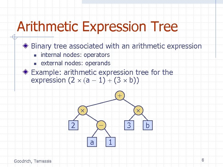 Binary Trees (§ 6. 3) Applications: A binary tree is a tree with the following properties: n n n Each internal node has at most two children (exactly two for proper binary trees) The children of a node are an ordered pair n n A We call the children of an internal node left child and right child Alternative recursive definition: a binary tree is either n n a tree consisting of a single node, or a tree whose root has an ordered pair of children, each of which is a binary tree arithmetic expressions decision processes searching B C D H Goodrich, Tamassia F E G I 7