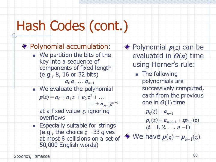 Hash Codes (cont. ) Polynomial accumulation: n n n We partition the bits of the key into a sequence of components of fixed length (e. g. , 8, 16 or 32 bits) a 0 a 1 … an-1 We evaluate the polynomial p(z) = a 0 + a 1 z + a 2 z 2 + … … + an-1 zn-1 at a fixed value z, ignoring overflows Especially suitable for strings (e. g. , the choice z = 33 gives at most 6 collisions on a set of 50, 000 English words) Goodrich, Tamassia Polynomial p(z) can be evaluated in O(n) time using Horner’s rule: n The following polynomials are successively computed, each from the previous one in O(1) time p 0(z) = an-1 pi (z) = an-i-1 + zpi-1(z) (i = 1, 2, …, n -1) We have p(z) = pn-1(z) 80