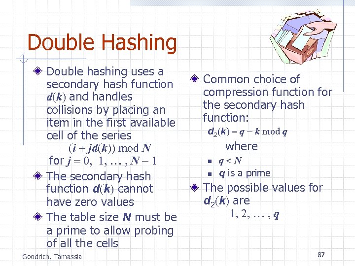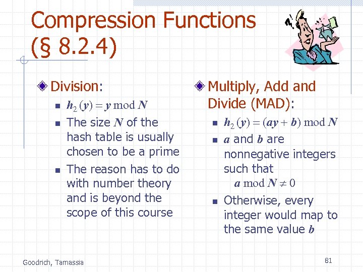 Compression Functions (§ 8. 2. 4) Division: n n n h 2 (y) = y mod N The size N of the hash table is usually chosen to be a prime The reason has to do with number theory and is beyond the scope of this course Goodrich, Tamassia Multiply, Add and Divide (MAD): n n n h 2 (y) = (ay + b) mod N a and b are nonnegative integers such that a mod N 0 Otherwise, every integer would map to the same value b 81