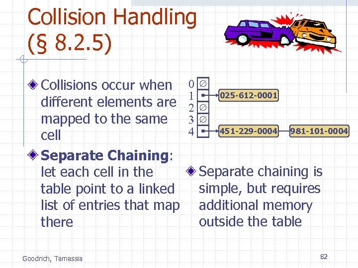 Collision Handling (§ 8. 2. 5) Collisions occur when different elements are mapped to the same cell Separate Chaining: let each cell in the table point to a linked list of entries that map there Goodrich, Tamassia 0 1 2 3 4 025 -612 -0001 451 -229 -0004 981 -101 -0004 Separate chaining is simple, but requires additional memory outside the table 82