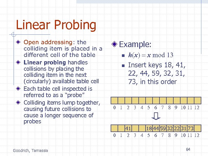 Linear Probing Open addressing: the colliding item is placed in a different cell of the table Linear probing handles collisions by placing the colliding item in the next (circularly) available table cell Each table cell inspected is referred to as a “probe” Colliding items lump together, causing future collisions to cause a longer sequence of probes Example: n n h(x) = x mod 13 Insert keys 18, 41, 22, 44, 59, 32, 31, 73, in this order 0 1 2 3 4 5 6 7 8 9 10 11 12 41 18 44 59 32 22 31 73 0 1 2 3 4 5 6 7 8 9 10 11 12 Goodrich, Tamassia 84