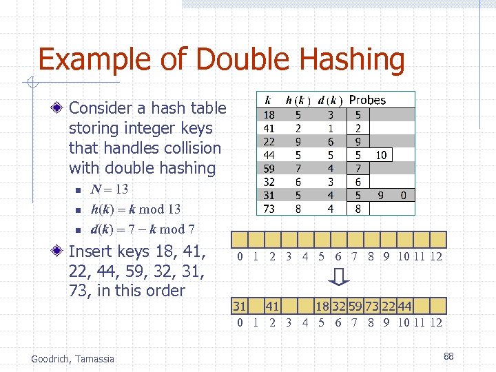 Example of Double Hashing Consider a hash table storing integer keys that handles collision with double hashing n n n N = 13 h(k) = k mod 13 d(k) = 7 - k mod 7 Insert keys 18, 41, 22, 44, 59, 32, 31, 73, in this order Goodrich, Tamassia 0 1 2 3 4 5 6 7 8 9 10 11 12 31 41 18 32 59 73 22 44 0 1 2 3 4 5 6 7 8 9 10 11 12 88