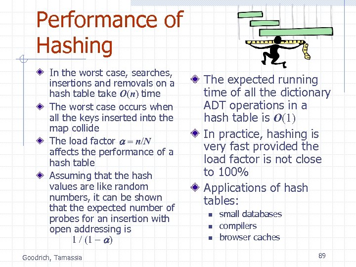 Performance of Hashing In the worst case, searches, insertions and removals on a hash table take O(n) time The worst case occurs when all the keys inserted into the map collide The load factor a = n/N affects the performance of a hash table Assuming that the hash values are like random numbers, it can be shown that the expected number of probes for an insertion with open addressing is 1 / (1 - a) Goodrich, Tamassia The expected running time of all the dictionary ADT operations in a hash table is O(1) In practice, hashing is very fast provided the load factor is not close to 100% Applications of hash tables: n n n small databases compilers browser caches 89