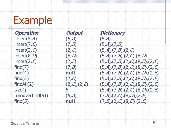 Example Operation insert(5, A) insert(7, B) insert(2, C) insert(8, D) insert(2, E) find(7) find(4) find(2) find. All(2) size() remove(find(5)) find(5) Goodrich, Tamassia Output (5, A) (7, B) (2, C) (8, D) (2, E) (7, B) null (2, C), (2, E) 5 (5, A) null Dictionary (5, A), (7, B), (2, C), (8, D) (5, A), (7, B), (2, C), (8, D), (2, E) (5, A), (7, B), (2, C), (8, D), (2, E) 94
