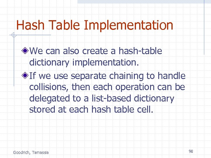 Hash Table Implementation We can also create a hash-table dictionary implementation. If we use separate chaining to handle collisions, then each operation can be delegated to a list-based dictionary stored at each hash table cell. Goodrich, Tamassia 98