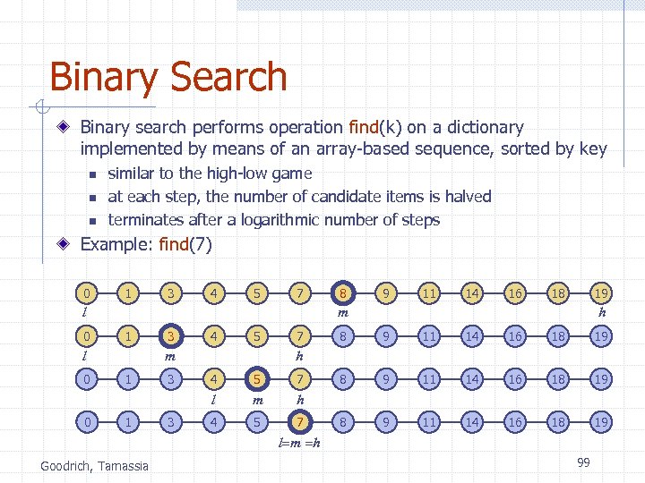 Binary Search Binary search performs operation find(k) on a dictionary implemented by means of an array-based sequence, sorted by key n n n similar to the high-low game at each step, the number of candidate items is halved terminates after a logarithmic number of steps Example: find(7) 0 1 3 4 5 7 1 3 4 5 m l 0 1 1 3 7 11 14 16 18 19 3 h 8 9 11 14 16 18 19 h 4 5 7 l 0 9 m l 0 8 m h 4 5 7 l=m =h Goodrich, Tamassia 99