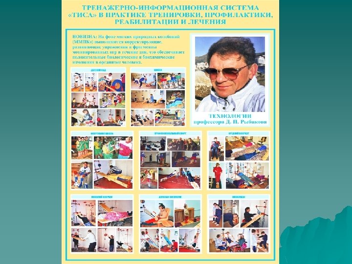 Запатентованная тренажерно-информационная система «ТИСА» Двадцать пять лет применяется в более чем 800 учреждениях Санкт. Петербурга: Комитета по образованию: детские сады и школы. Комитета по физической культуре и спорту: детские юношеские спортивные школы и профессиональные спортивные клубы. Комитета социальной защиты населения: центры для детей-инвалидов и центры социального обслуживания для пенсионеров и инвалидов Комитета по здравоохранению: детские и взрослые поликлиники, больницы, санатории.