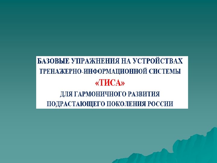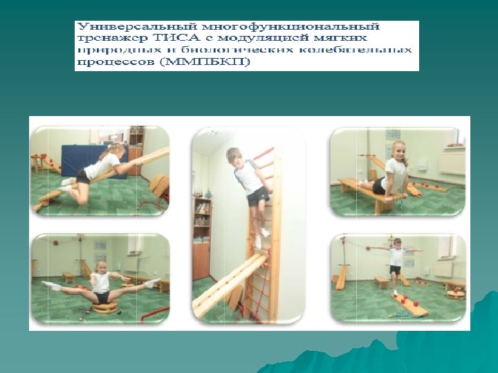 Практическое применение тренажерно -информационной системы «ТИСА» в детских дошкольных учреждениях u u u 1. Обеспечивает индивидуальный подход в процессе гармоничного развития ребенка; 2. Улучшает психофизиологические функции: внимание, память, быстроту мышления, управление движением; 3. Нагружает все основные скелетные мышцы, корректирует осанку создавая условия для правильного расположения внутренних органов и согласованной работы всех систем организма ребенка; 4. Формирует двигательные навыки, обеспечивающие безопасность при несчастных случаях; 5. Обладает широкой гаммой трансформации модулей, что позволяет задавать различные исходные положения и способствовать правильному выполнению основной фазы сложно координированных движений; 6. Создает условия для изучения элементов техники в спортивных играх; 7. Имеет высокую степень безопасности применения, экологически чиста.