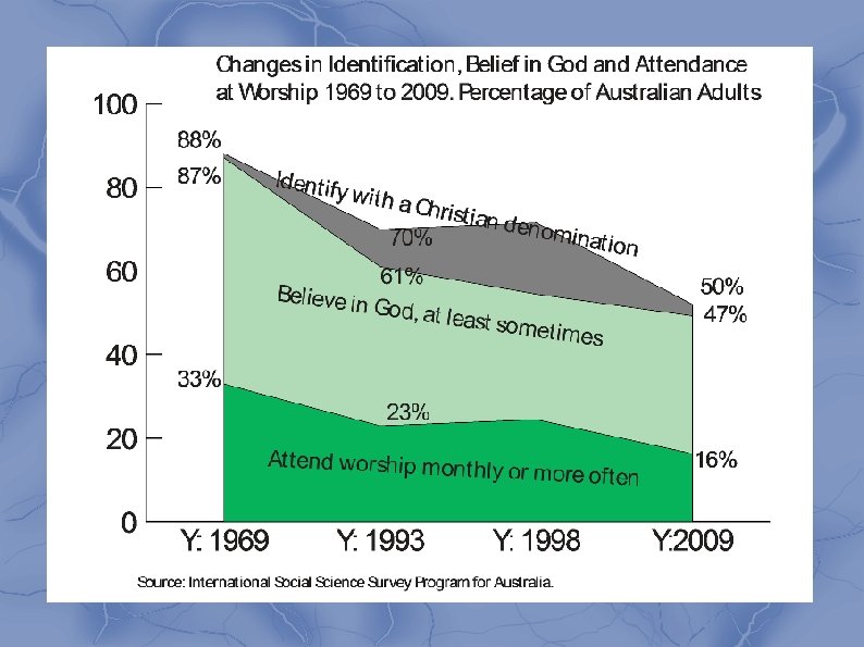 For most Australians Religion is simply not on the agenda Most do not feel any need for it Except as encouraging care Around 25% of the population 'do not know' if there is a God, and another 35% are not at all sure And have no particular reason to solve the issue