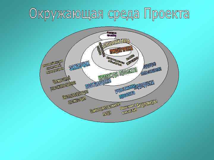 Окружение проекта. Участники проекта (стейкхолдеры) Окружение проекта (Project Environment) – среда проекта, порождающая совокупность внутренних и внешних сил, которые способствуют или мешают достижению целей проекта. Выделяют ближнее и дальнее окружение. Участники проекта (Stakeholders) – физические лица и организации, которые непосредственно вовлечены в проект или чьи интересы могут быть затронуты при осуществлении проекта.