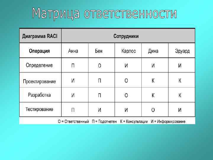 Матрица ответственности проекта – структура, которая ставит в соответствие организационной структуре проекта (OBS) структурную декомпозицию работ (WBS) для назначения ответственных за каждую работу и части проекта.