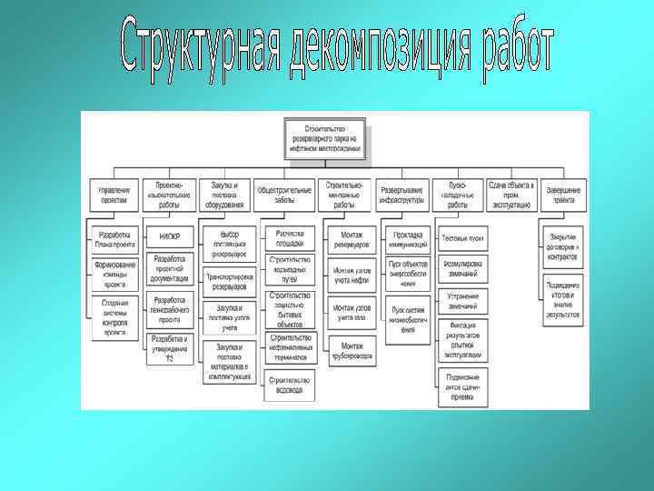 Структурная декомпозиция работ (WBS) – иерархическая структура работ проекта, ориентированная на основные результаты проекта, определяющие его предметную область. Каждый нижестоящий уровень структуры представляет собой детализацию вышестоящего уровня проекта. Элементом проекта может быть как продукт, услуга, так и пакет работ или работа.