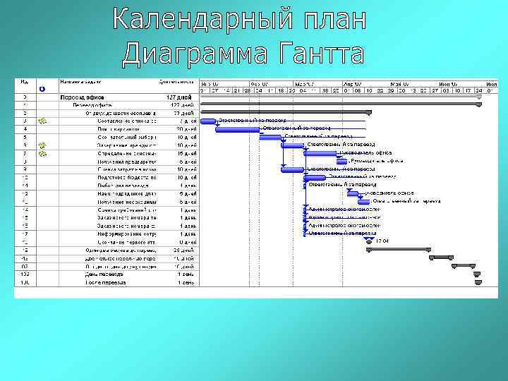 Диаграмма Гантта (Gantt Chart) – частная разновидность линейного графика, отображающая план работ во времени. График Гантта является поэтапным изображением продолжительности работ во времени. Работы и другие табличные данные помещаются с левой стороны, а продолжительности работ отображаются с помощью горизонтальных лент.