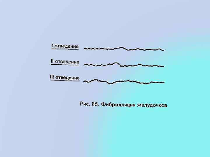 • При мерцании (фибрилляции) желудочков на ЭКГ регистрируются различные по форме и амплитуде волны, отражающие возбуждение отдельных мышечных волокон желудочков и возникающие с частотой от 200 до 500 в минуту. Они отличаются полной хаотичностью и нерегулярностью