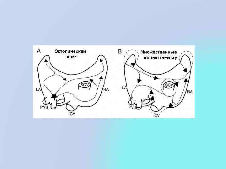 Механизм re entry • При трепетании желудочков волна возбуждения циркулирует по мышце желудочков ритмично по одному и тому же пути, а при мерцании направление движения волны возбуждения постоянно меняется, что приводит к нерегулярному беспорядочно му возбуждению и сокращению отдельных групп мышечных волокон желудочков — фибрилляции желудочков. •