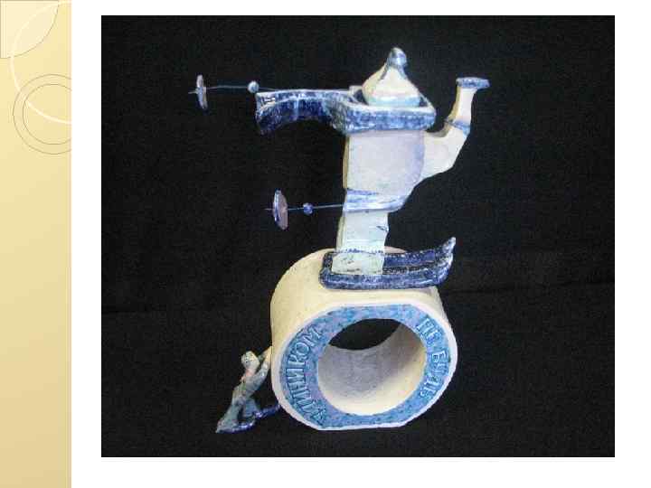 Музыкальные пристрастия получают дальнейшее развитие в оригинальной шкатулке в виде ожившего граммофона, пританцовывающего под звуки крутящейся пластинки ( «Ах, эта музыка звучала» , 2011). Третьякова Лариса. «Ах, эта музыка звучала…» 2011 Шамот, глазурь; лепка, роспись. 63, 0 х32, 0 Х 32, 0