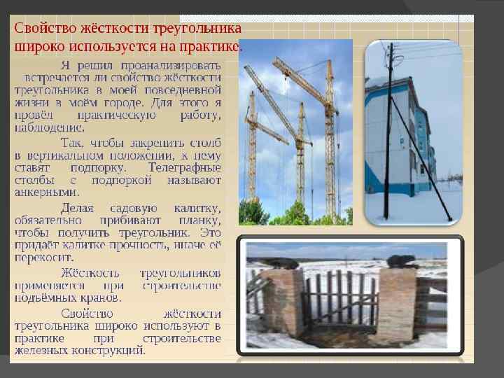 Жёсткость треугольника Третий признак равенства треугольников. Если три стороны одного треугольника соответственно равны трем сторонам другого треугольника, то такие треугольники равны. Из третьего признака равенства треугольников следует, что треугольник - жёсткая фигура. Поясню, что это означает. Представим себе две рейки, у которых два конца скреплены гвоздем. Такая конструкция не является жёсткой: сдвигая или раздвигая свободные концы реек, мы можем менять угол между ними. Теперь возьмем ещё одну рейку и скрепим её концы со свободными концами первых двух реек. Полученная конструкция - треугольник - будет уже жёсткой. В ней нельзя сдвинуть или раздвинуть никакие две стороны, т. е. нельзя изменить ни один угол. Действительно, если бы это удалось, то мы получили бы новый треугольник, не равный исходному. Но это невозможно, так как новый треугольник должен быть равен исходному по третьему признаку равенства треугольников.