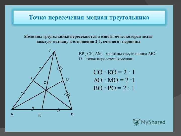 Точка пересечения медиан называется центром тяжести треугольника. Если треугольник будет опираться на эту точку, то он будет в равновесии. Кроме того, в точке пересечения медианы делятся в отношении 2: 1, начиная от вершин.