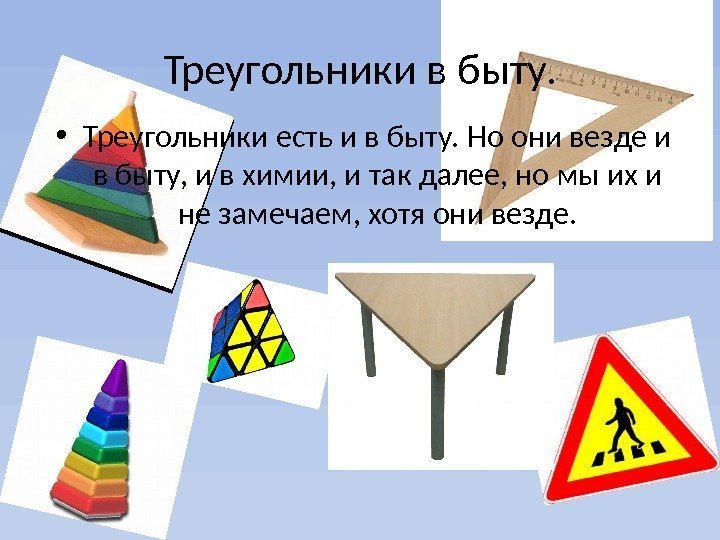 Треугольники в быту. • Треугольники есть и в быту. Но они везде и в быту, и в химии, и так далее, но мы их и не замечаем, хотя они везде.
