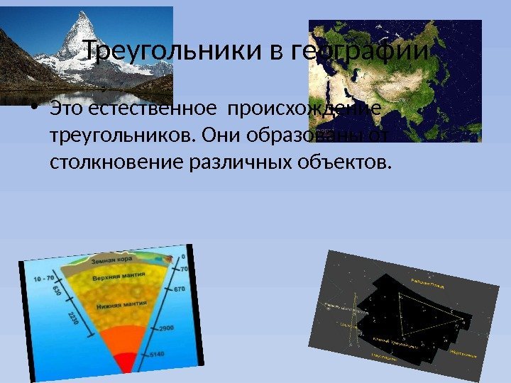 Треугольники в географии • Это естественное происхождение треугольников. Они образованы от столкновение различных объектов.