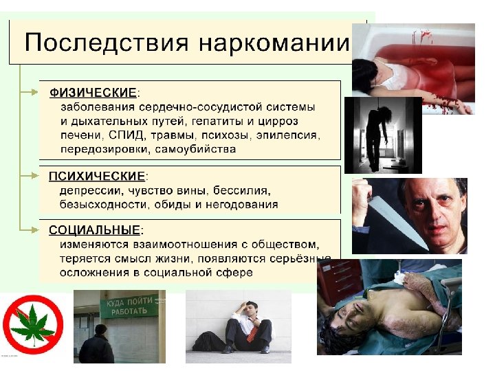 Наркомания - (от греч. «оцепенение, сон, безумие» ) – это хроническое заболевание, вызванное употреблением наркотиков Признаки наркомании: • непреодолимое влечение к приёму наркотиков; • тенденция к повышению количества принимаемого вещества