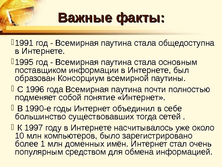 Важные факты: 1991 год — Всемирная паутина стала общедоступна в Интернете. 1995 год — Всемирная паутина стала основным поставщиком информации в Интернете, был образован Консорциум всемирной паутины. С 1996 года Всемирная паутина почти полностью подменяет собой понятие «Интернет» . В 1990 -е годы Интернет объединил в себе большинство существовавших тогда сетей. К 1997 году в Интернете насчитывалось уже около 10 млн компьютеров, было зарегистрировано более 1 млн доменных имён. Интернет стал очень популярным средством для обмена информацией.