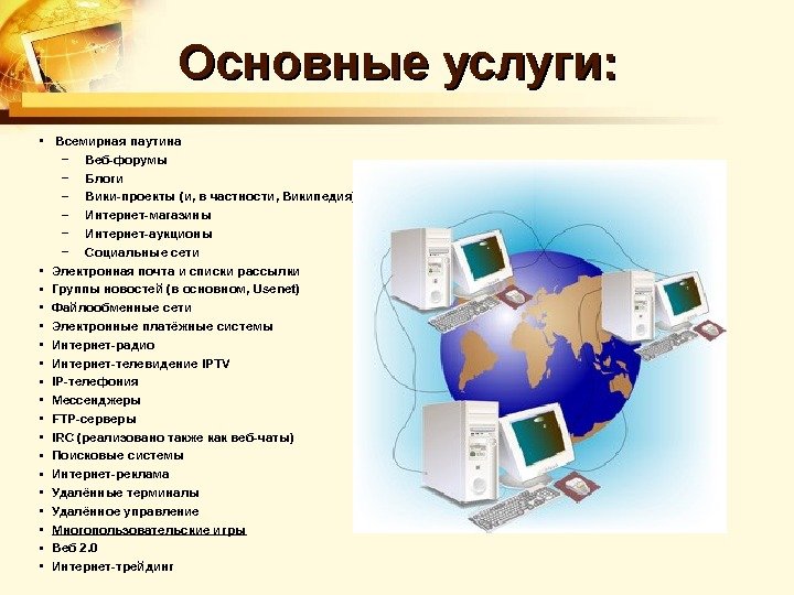 Основные услуги: • Всемирная паутина – Веб-форумы – Блоги – Вики-проекты (и, в частности, Википедия) – Интернет-магазины – Интернет-аукционы – Социальные сети • Электронная почта и списки рассылки • Группы новостей (в основном, Usenet) • Файлообменные сети • Электронные платёжные системы • Интернет-радио • Интернет-телевидение IPTV • IP-телефония • Мессенджеры • FTP-серверы • IRC (реализовано также как веб-чаты) • Поисковые системы • Интернет-реклама • Удалённые терминалы • Удалённое управление • Многопользовательские игры • Веб 2. 0 • Интернет-трейдинг